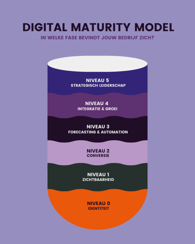 Digitale volwassenheid ontwikkelt zich in fasen. Bij elk niveau verandert niet alleen wat je doet, maar ook waar je op stuurt. En dat werkt helemaal van bereik door naar de impact die marketing structureel op de business heeft.